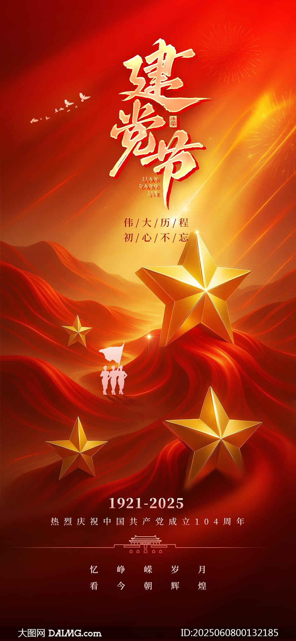 特别说明建党104周年七一建党节海报PSD素材下载,素材包含建党104周年宣传海报、七一建党节手机移动端海报等内容,图片编号为2025060800132185,素材格式为PSD,素材大小为7.38 MB,素材以RAR压缩包形式提供下载,下载后请自行解压,大图网提供该素材下载服务。