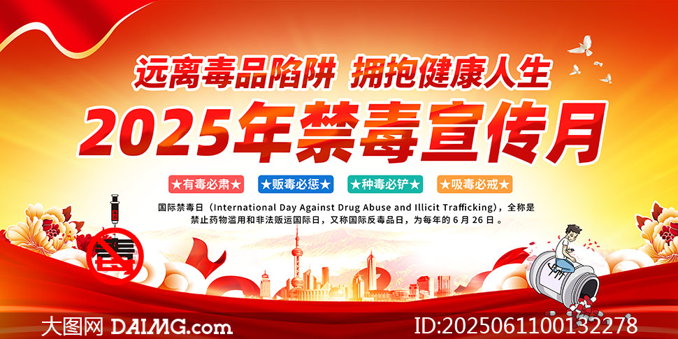 素材标签2025年国际禁毒日 国际禁毒日 2025年全民禁毒宣传月 全民禁毒宣传月 第38个国际禁毒日 626国际禁毒日 有毒必肃 贩毒必惩 种毒必铲 吸毒必戒 远离毒品陷阱 拥抱健康人生 禁毒知识科普 国际禁毒日宣传栏 国际禁毒日展板 展板设计模板 PSD素材