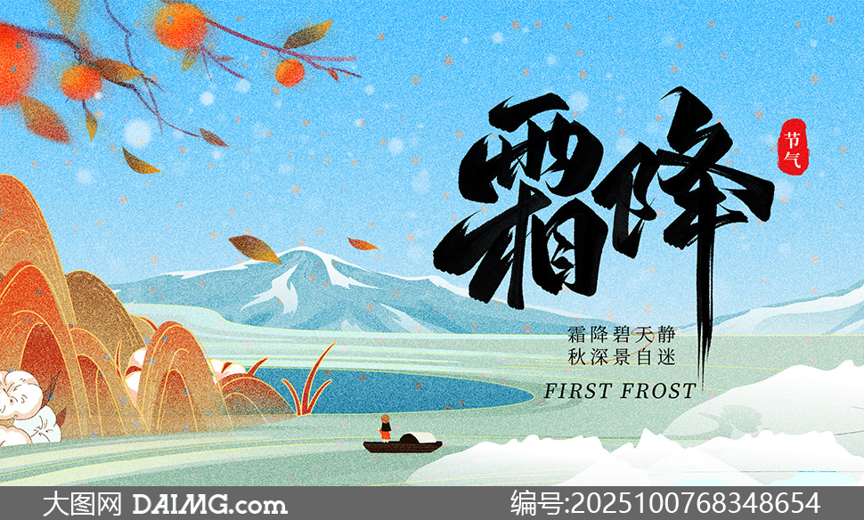 素材标签霜降海报 霜降 霜降时节 霜降节气 柿子 霜降插画 山水 小船 山峦 霜降碧天静 秋深景自迷 二十四节气 24节气 中国传统节气 24节气海报 霜降海报 霜降节气海报 霜降节气宣传海报 霜降横版海报 霜降全屏海报 节气海报 霜降展板 PSD素材