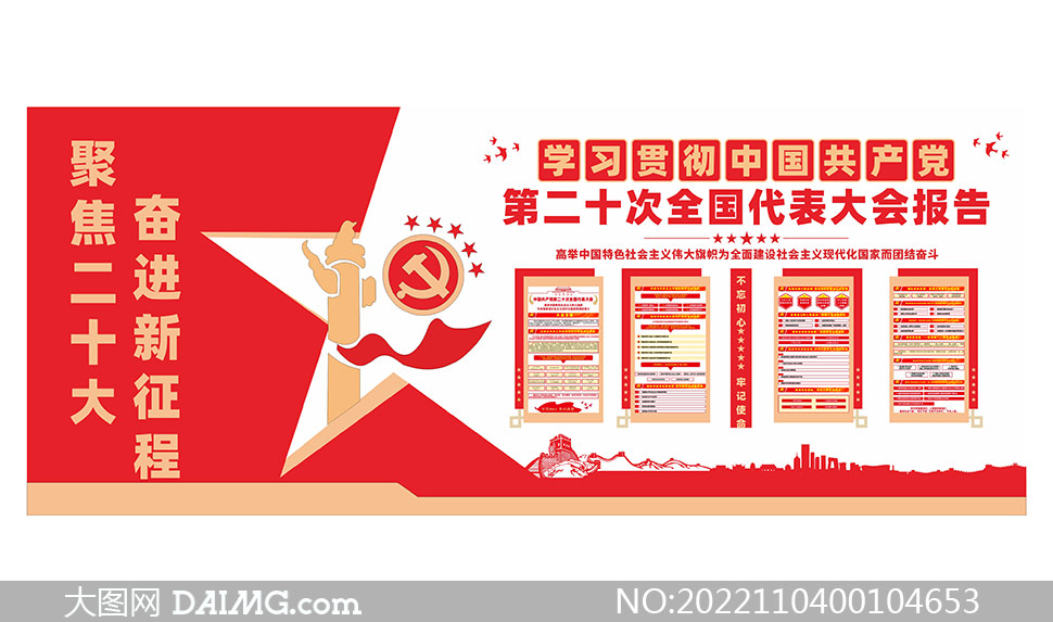 素材标签党的二十大 党的二十大报告 二十大报告 二十大精神 解读党的二十大报告 学习贯彻党的二十大精神 聚焦二十大 奋进新征程 不忘初心牢记使命 高举中国特色社会主义伟大旗帜 全面建设社会主义现代化国家 党的二十大报告文化墙 党的二十大精神文化墙 党建文化墙模板 矢量素材